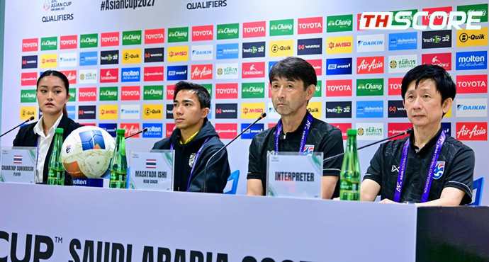 การแถลงข่าวครั้งนี้ทีมชาติไทย นำโดย มาซาทาดะ อิชิอิ หัวหน้าผู้ฝึกสอน และ ชนาธิป สรงกระสินธ์ กัปตันทีม